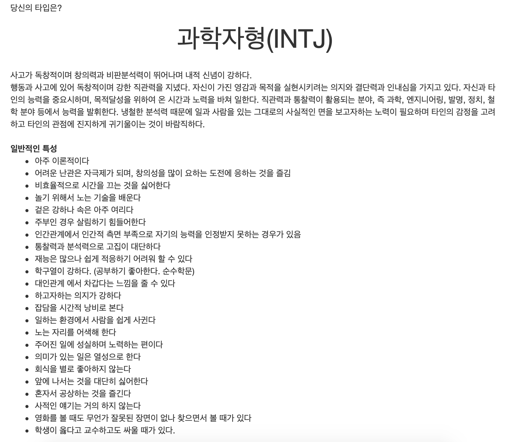 사실 상황에 따라 감성적으로 대하기도, 이성적으로 대하기도 한다. 그래서 내 추측으로는 쓸데 없이 감정 소비할 필요 없이 나에게 집중할 수 있는 (특히 요즘 재택근무로 인해 사람 만날 일이 없기도 한) 때라 INTJ가 나오는 것 같고, 다시 출근하면서 사회생활에 치이고 하면 INFJ가 나오지 않을까.. 하고 추측하고 있다. 더불어 선천적인 성격과 후천적으로 환경의 영향을 받았기 때문에 좀 다를 수도 있겠고, 추후 좀 더 생각 정리가 되면 추가로 포스팅 해보겠다.